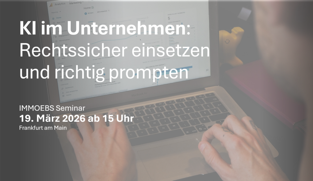 Unternehmen sind durch die EU-Verordnung über Künstliche Intelligenz (KI-VO) dazu verpflichtet, ihre Mitarbeiter angemessen zu schulen. Das gilt auch für alle Immobilienunternehmen – egal, welcher Größe. So soll der sichere, ethische und verantwortungsvolle Einsatz von KI-Systemen gewährleistet werden. Mit „KI im Unternehmen“ bietet IMMOEBS seinen Mitgliedern ein praxisnahes Seminar in Kooperation mit der Kanzlei ARNECKE SIBETH DABELSTEIN. Teilnehmer lernen in wenigen Stunden die Basics der KI-Nutzung im Unternehmen. Worauf müssen sie rechtlich achten? Wie sieht eigentlich ein richtiger Prompt aus? uvm.